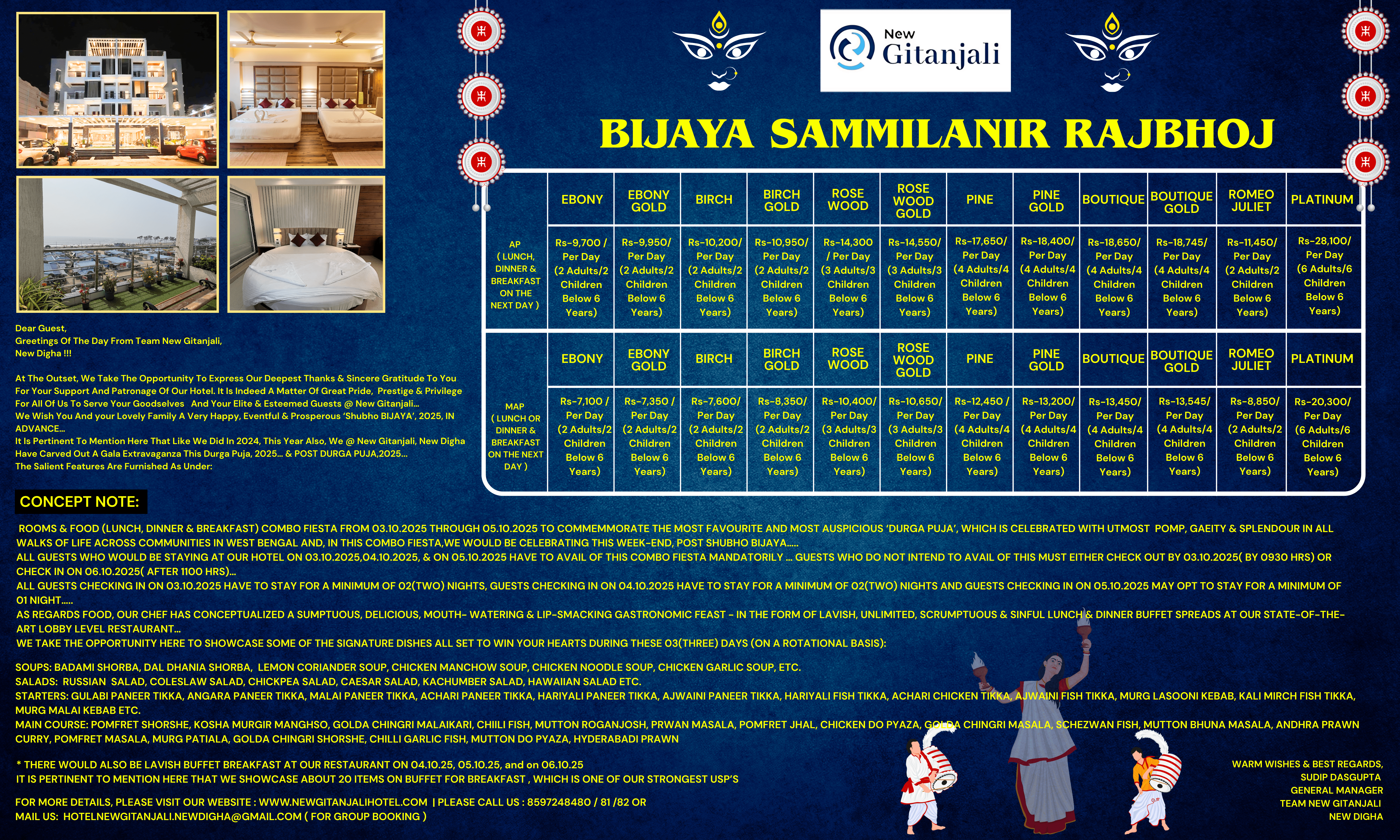 At Hotel New Gitanjali, enjoy modern comfort just steps from New Digha Sea Beach. From cozy rooms to fine dining, 24×7 front desk, and complete room service — everything is designed to make your stay relaxing and memorable. Perfect for families, couples, and corporate travelers.