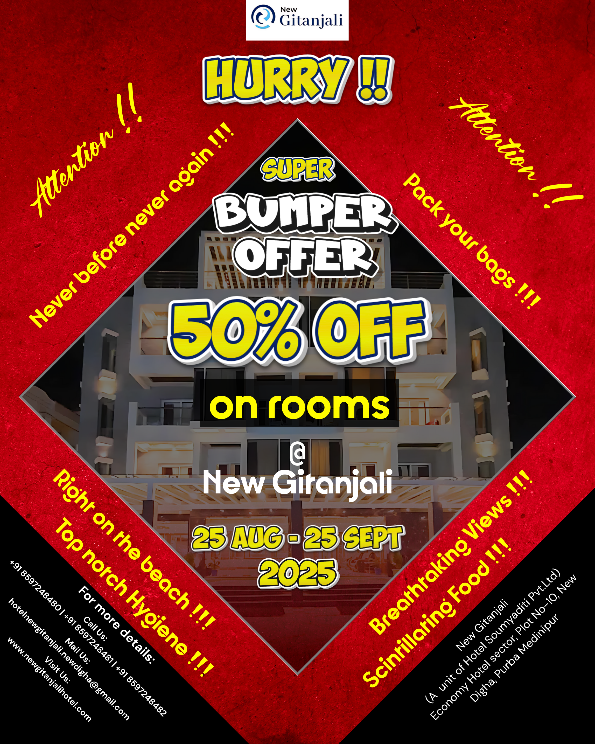 Welcome to Hotel New Gitanjali, one of the best hotels in New Digha offering beautifully designed sea-facing rooms near Digha beach. Enjoy luxury, comfort, and top-class hospitality with 24×7 room service, modern interiors, and peaceful ambiance — ideal for families, couples, and business travelers. Book your perfect seaside getaway now!